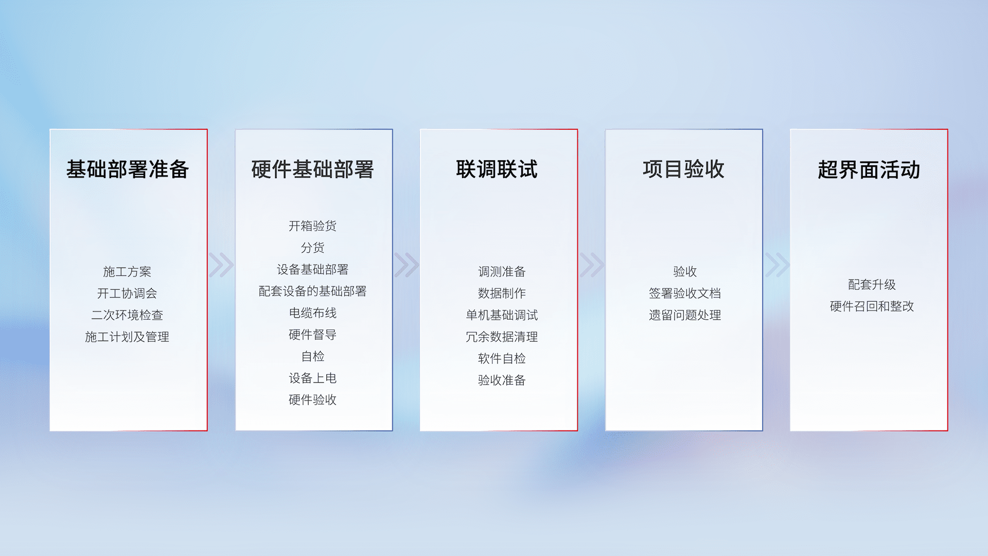 从基础部署准备、、、、硬件基础部署、、联调联试、、项目验收、、、、越界面活动的全过程可追溯,,,,保证施工质量和进度。。。。